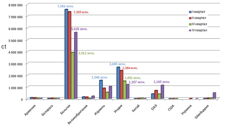 Экспорт ОАЭ и Швейцарии составил $68,5 млн. (2,6 млн. карат) и $48,4 млн. (0,6 млн. карат), соответственно.