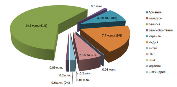 | Экспорт российского алмазного сырья в стоимостном выражении по итогам 2010 года (по странам, в долл. США) |