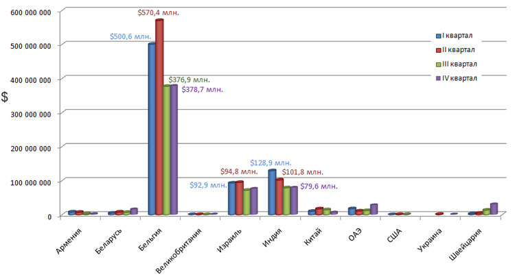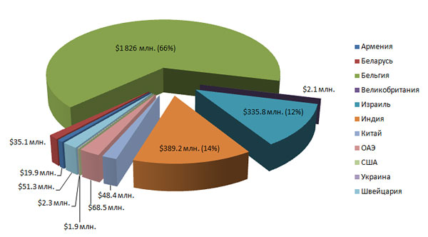 На протяжении всего 2010 года основными покупателями российских алмазов были три страны – Бельгия, Индия и Израиль. К концу года «рывок» сделали также Объединенные Арабские Эмираты и Швейцария.