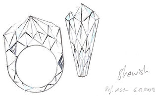 Оно будет продемонстрировано публике 14 апреля в Лондоне (на фото показан эскиз этого кольца). Всем известны камнерезные изделия из поделочных и даже ювелирных камней, но никогда еще не бывало кольца, изготовленного из самого твердого минерала – алмаза.